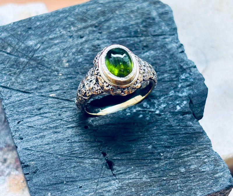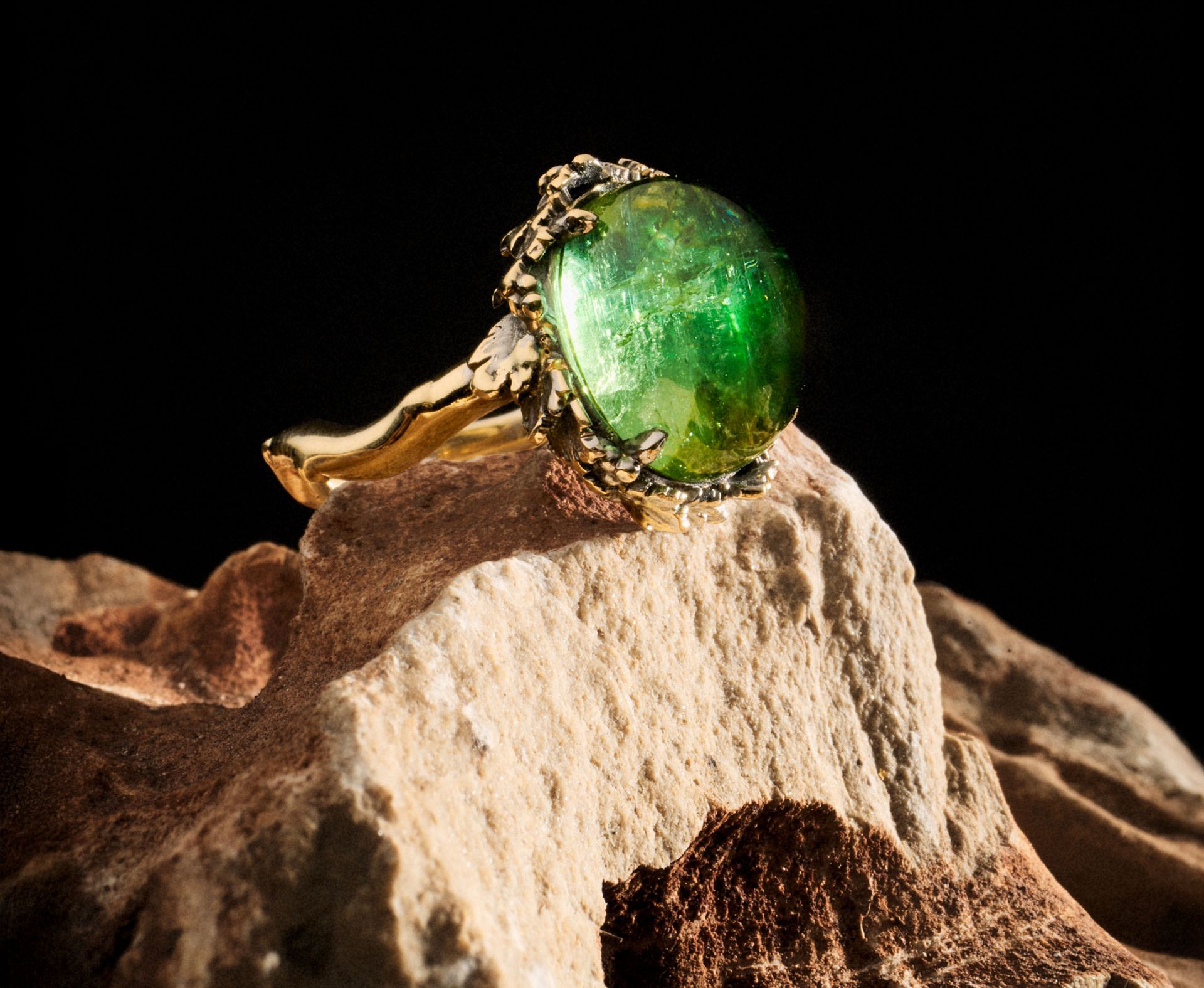 The STYRIARTRING by Johann Juwelier überzeugt mit vielen Highlights aus der Steiermark. In Gelbgold GEFERTIGT, ZIEREN Weinblätter den Steiermark grünen Turmalin, welcher von zarten Ästen gehalten wird.